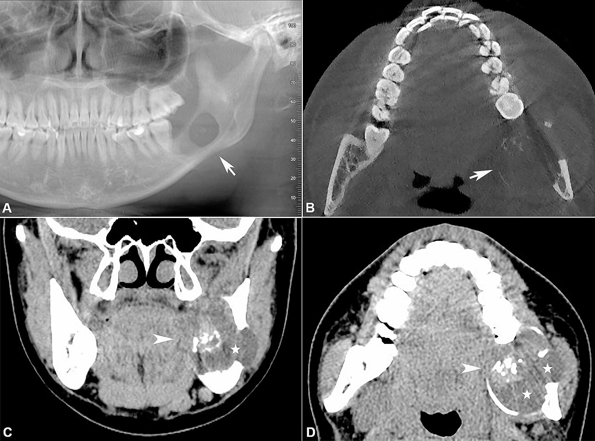 Hasil pemeriksaan radiografi. Tampilan panoramik yang telah direkonstruksi (A) dan pada tampilan aksial (B) terlihat adanya satu ruang lesi (unilokular) dengan batas yang jelas, tampak sebagai area berwarna gelap (radiolucent) yang berisi bahan padat berwarna terang (radiopaque) di bagian belakang rahang bawah sebelah kiri. Lesi tersebut menyebabkan pelebaran yang cukup besar dan juga penipisan hingga berlubang pada dinding tulang bagian luar (bukal) dan dalam (lingual) rahang bawah (ditunjukkan dengan panah). Pada tampilan koronal (C) dan aksial (D) terlihat adanya massa dengan batas yang jelas dan tampak tidak seragam. Massa tersebut terdiri dari bagian padat (ditunjukkan dengan kepala panah) dan bagian berisi cairan atau kistik (ditandai dengan bintang). Terlihat juga adanya endapan kalsifikasi yang tampak jelas pada gambar.